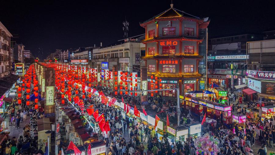 지난 2일 밤 허난(河南)성 뤄양(洛陽)시 구시가지에 많은 인파가 몰린 모습을 드론 사진에 담았다. (사진/신화통신)