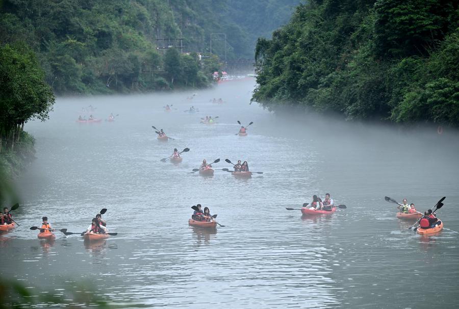 관광객들이 3일 후베이(湖北)성 쉬안언(宣恩)현 스쯔관(獅子關) 관광지 호수에서 배를 타며 즐거운 시간을 보내고 있다. (사진/신화통신)
