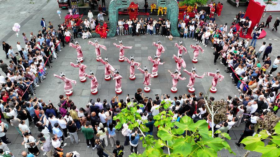 3일 관광객들이 쓰촨(四川)성 랑중(閬中)시 고성 궁위안(貢院)광장에서 열린 북춤 공연을 관람하는 모습을 드론으로 내려다 봤다. (사진/신화통신)
