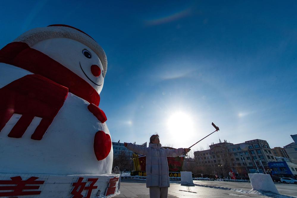 16일 헤이룽장성 푸진(富錦)시를 방문한 관광객이 대형 눈사람을 휴대전화 사진에 담고 있다. 2026.1.17