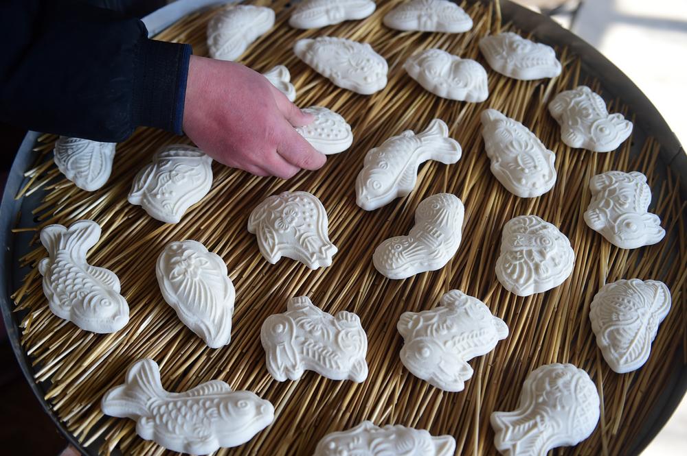 [신화망 창저우 1월23일]22일 허베이(河北)성 창저우(滄州)시의 한 마을에 위치한 몐화(面花·밀가루 등으로 인물이나 동물의 형상을 빚는 중국의 전통 민속 공예) 공방에서 몐화를 찜기에 담는 작업자.
