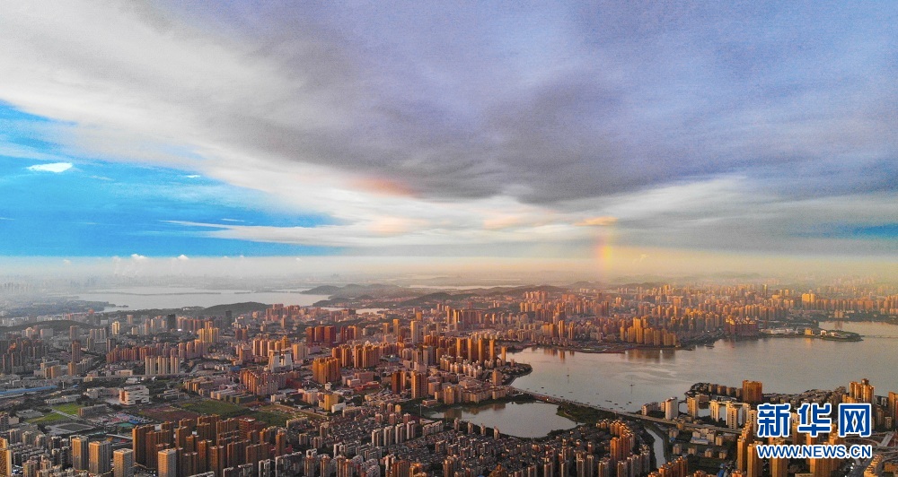 비가 내린 후 우한 하늘에 아름다운 저녁놀이 물들어 우한(武漢)에 색다른 운치를 더했다.