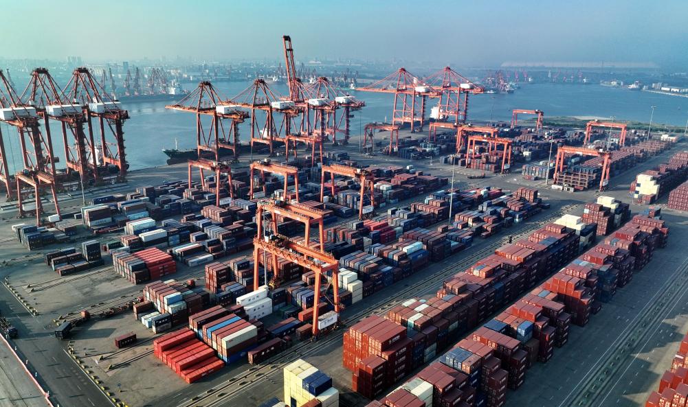 탕산항 징탕(京唐)항구 구역 컨테이너 부두를 19일 드론으로 내려다봤다. 2023.7.20