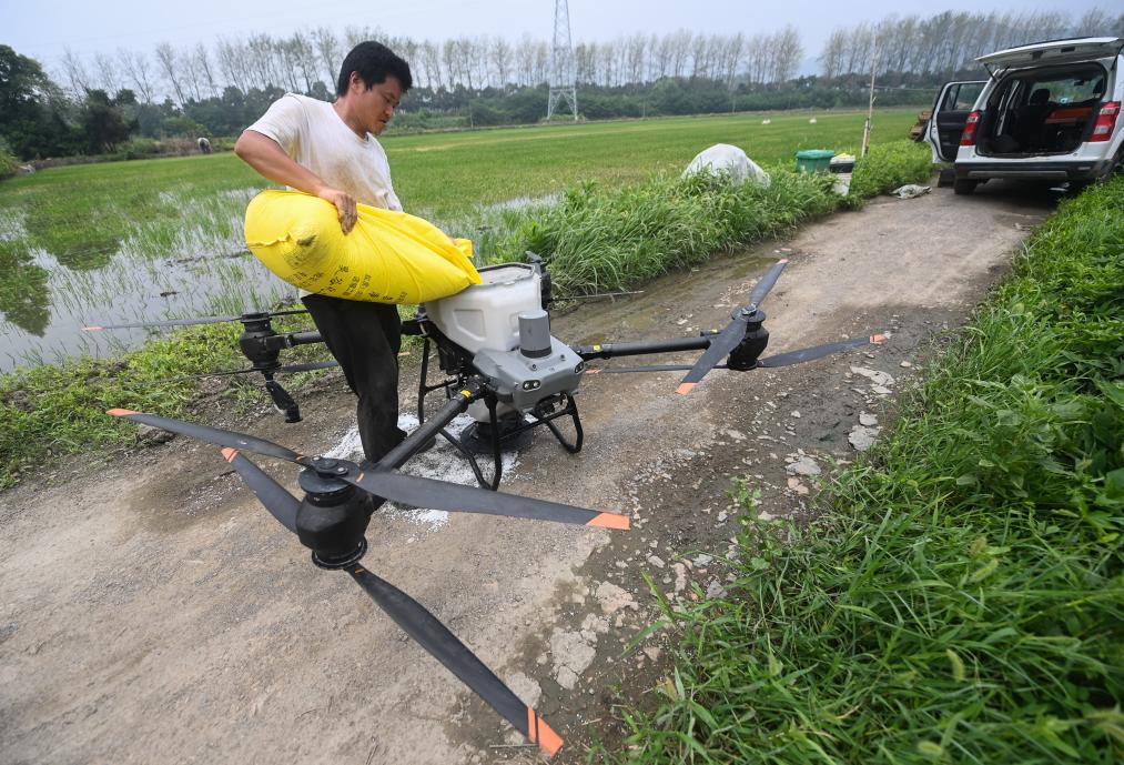 [신화망 후저우 7월20일] 19일 저장(浙江)성 후저우(湖州)시 둥린(東林)진의 한 마을에서 농민이 드론에 비료를 넣고 있다.