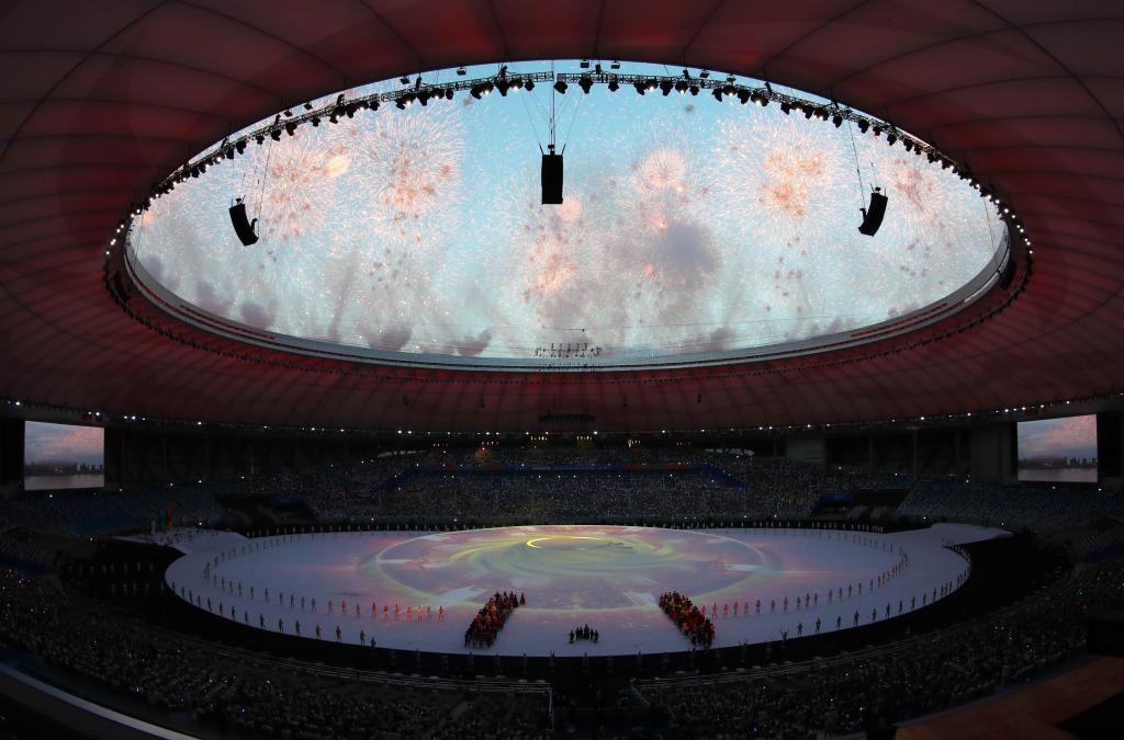 오후 7시58분 '평화-운명공동체' 노래가 울려 퍼지는 가운데 시진핑 주석과 부인 펑리위안(彭麗媛) 여사가 레온즈 에더 국제대학스포츠연맹(FISU) 집행위원회 회장 대행과 함께 연단에 올라 관중들을 향해 손을 흔들어 인사했다. 현장에선 박수소리가 한동안 이어졌다.