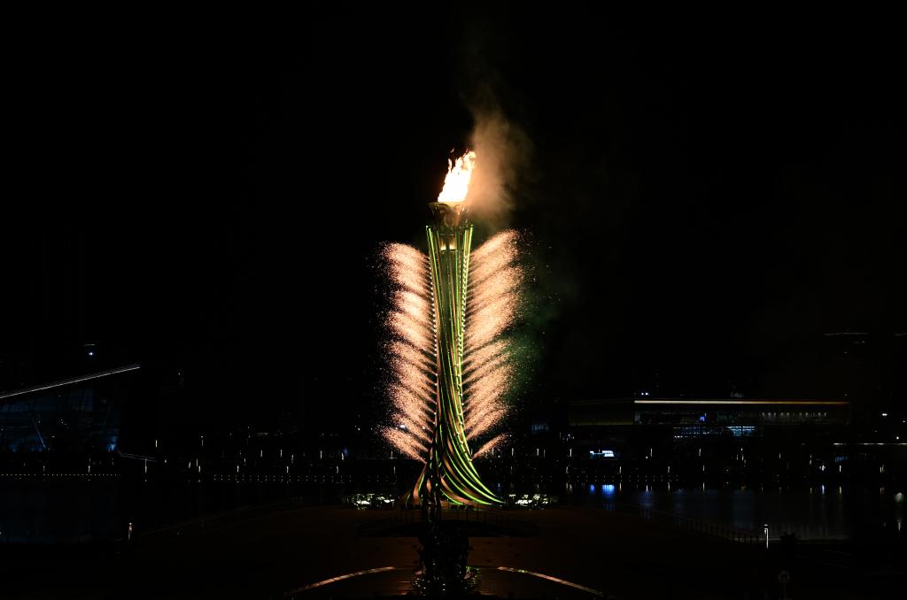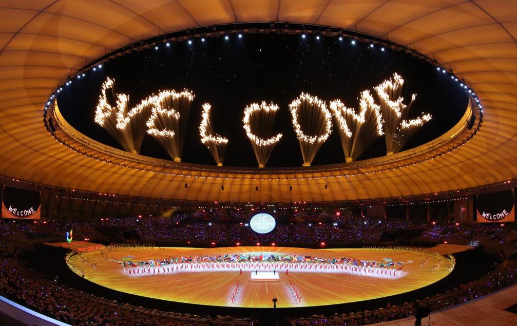 오후 9시16분 시진핑 주석이 '제31회 청두 하계유니버시아드' 개막을 선언하자, 장내가 뜨겁게 달아오르고 화려한 불꽃이 하늘로 치솟으며 '환영한다'는 의미의 중국어와 영어를 그려냈다.