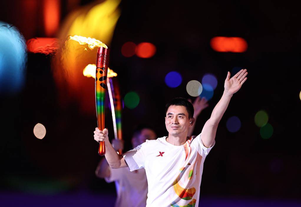 FISU 경기대회 개막식 당일 성화 봉송 주자가 손에 든 성화 룽훠(蓉火)가 오색찬란하게 빛났다. 성화 제작에는 연구기관의 여러 기술이 응축되어 있다.