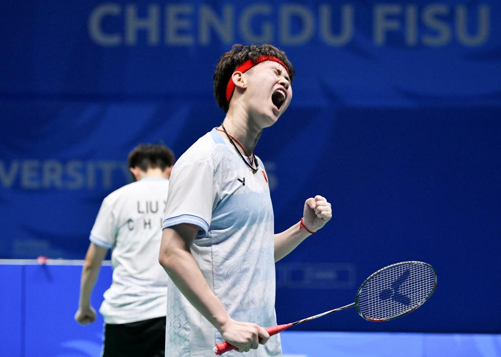 7일 FISU 경기대회 배드민턴 여자 복식 결승에서 중국팀 선수 리원메이(李汶妹), 류쉬안쉬안(劉玄炫)이 중국팀 선수 샤위팅(夏玉婷), 두웨(杜玥)를 꺾고 금메달을 차지했다. 리원메이(앞), 류쉬안쉬안 선수가 경기중 득점에 성공해 기뻐하고 있다. (사진/신화통신)