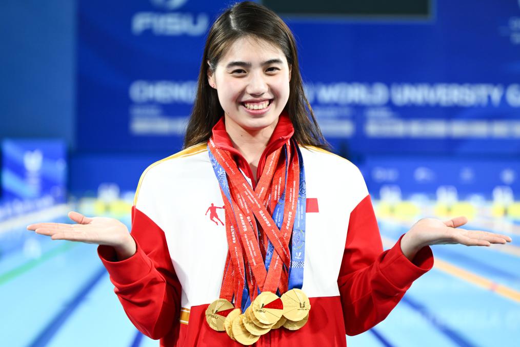 FISU 세계대학경기대회(유니버시아드) 수영 종목이 7일 끝이 났다. 중국 선수 장위페이(張雨霏)는 여자 자유영 50m, 여자 4x100m 혼계영에서 2개의 금메달을 획득하며 이번 대회 총 9개의 금메달을 목에 걸었다. 장위페이 선수가 이날 9개의 금메달을 목에 걸어 보이고 있다. (사진/신화통신)