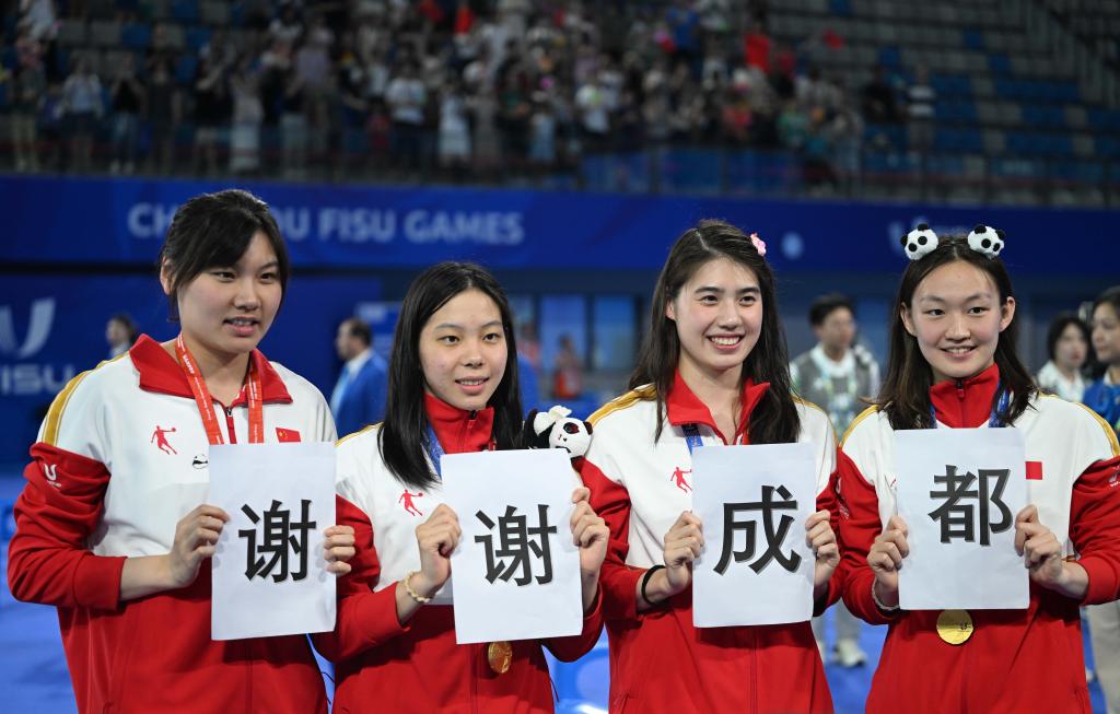 7일 FISU 경기대회 여자 4x100m 혼계영에서 류야신(柳雅欣), 주레이쥐(朱蕾桔), 장위페이(張雨霏), 리빙제(李冰潔) 선수(왼쪽부터)가 3분59초67의 성적으로 금메달을 획득했다. 류야신, 주레이쥐, 장위페이, 리빙제 선수가 '셰셰청두(謝謝成都·고마워요 청두)'라고 적힌 종이를 들고 있다. (사진/신화통신)