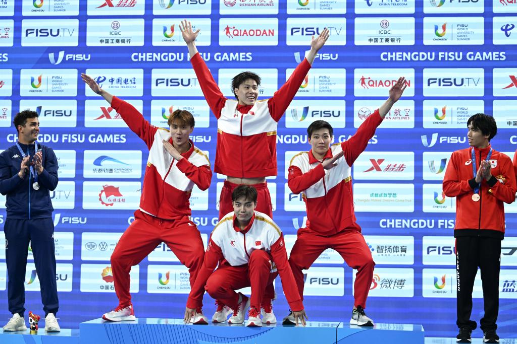 7일 FISU 경기대회 남자 4x100m 혼계영 결승에서 중국팀이 3분32초58의 성적으로 금메달을 획득했다. 중국팀 선수 천쥔얼(陳俊兒·왼쪽 두번째), 친하이양(覃海洋·가운데 위), 왕구카이라이(王谷開來·가운데 아래), 린타오(林濤·오른쪽 두번째)가 시상대에서 포즈를 취해 보이고 있다. (사진/신화통신)