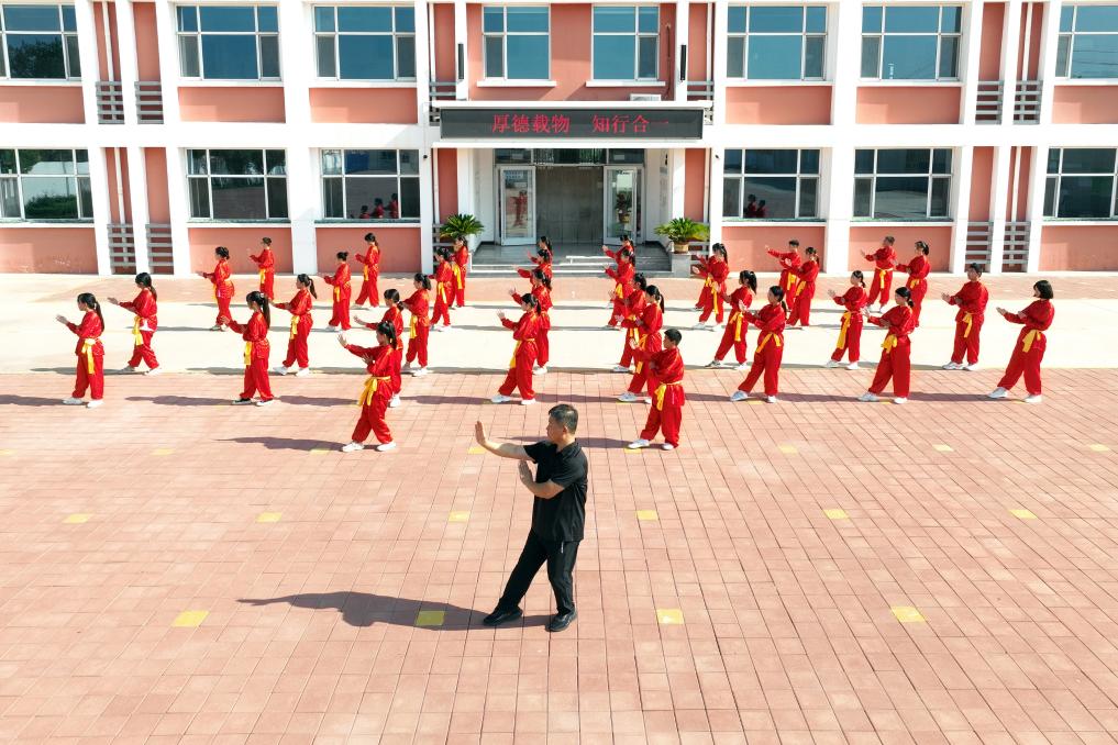 14일 창저우현 둥신좡(董辛莊)초등학교에서 무술을 배우고 있는 학생들의 모습을 드론에 담았다. 2023.8.14
