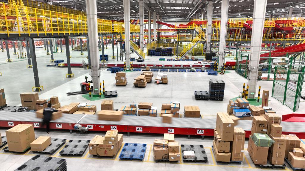 지난 3월 19일 광시(廣西)좡족자치구 류저우(柳州)시 류장(柳江)구 신흥공업단지의 한 물류 기업 내부를 드론에 담았다. (사진/신화통신)