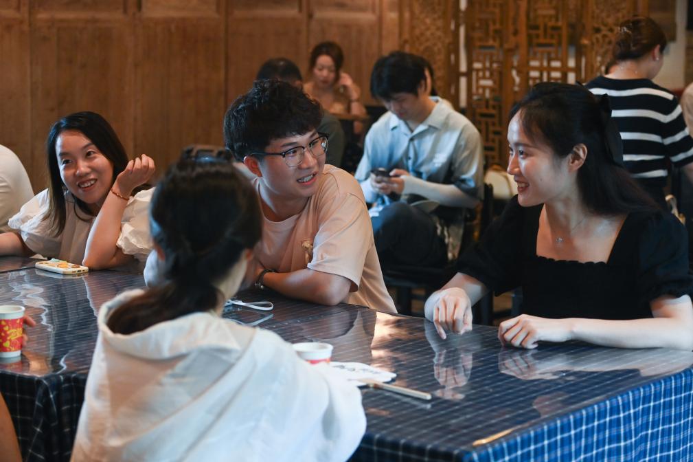 청년들이 20일 둥바이후진 위창하오(裕昌號)민간예술관에서 열린 십리홍장(十裏紅妝·중국의 전통 혼례) 친목 행사에 참여했다. 2023.8.21