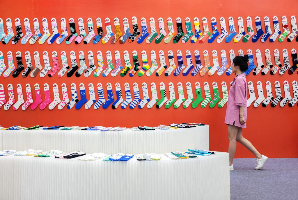 [신화망 주지 8월24일] 한 관람객이 23일 저장(浙江)성 주지(諸暨)시에서 열린 양말박람회를 둘러보고 있다.