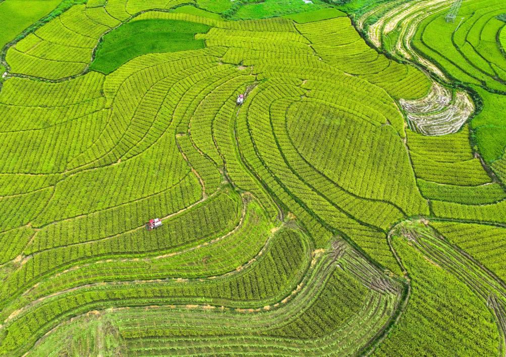 작업자들이 26일 구이저우성 천궁현에서 벼를 수확하고 있는 모습을 드론으로 내려다봤다. 2023.8.27