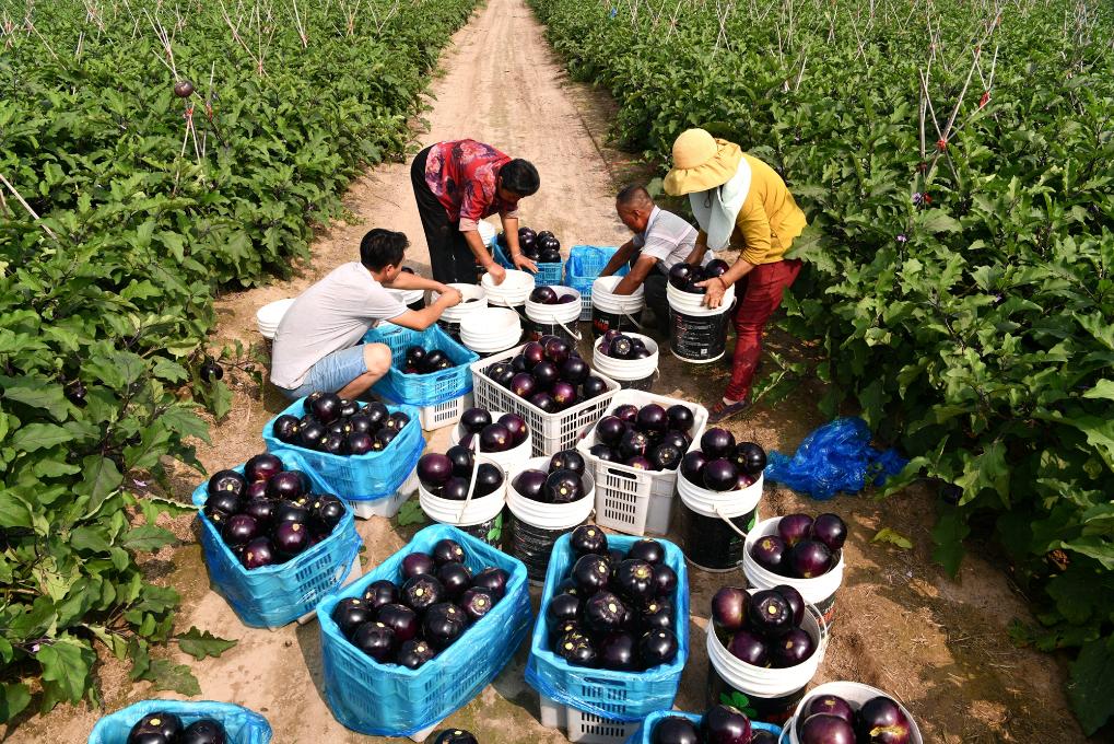 [신화망 베이징 9월8일]허베이(河北)성 스자좡(石家莊)시 롼청(欒城)구 루자좡(魯家莊)촌의 가지 농가가 시장 판매를 위해 수확한 가지를 포장하고 있다.