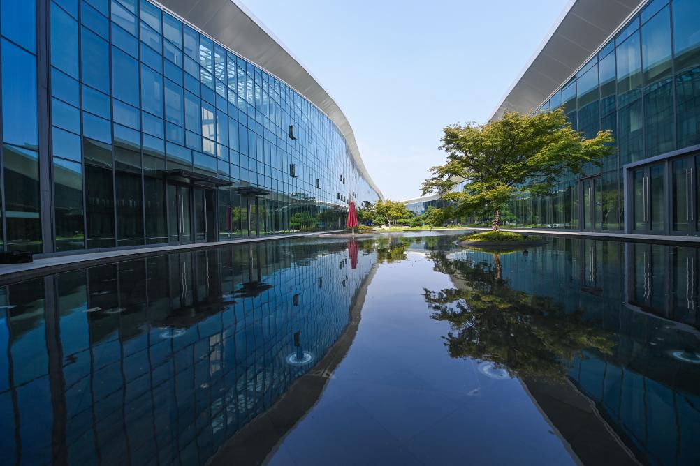 푸양 수상 스포츠센터는 전반적으로 심신에 안정을 주는 녹색으로 표현돼 친환경의 대회 이념을 반영했다.