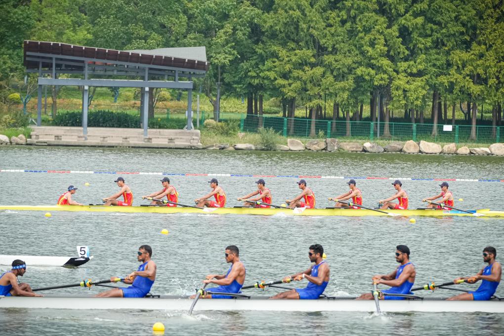 20일 항저우(杭州) 아시안게임에 참가한 중국 조정 선수들이 조정 남자 에이트(8인) 예선 경기를 치르고 있다. 이들은 5분34초93의 기록으로 본선에 올랐다. 항저우 아시안게임 조정 경기가 이날 저장(浙江)성 항저우시 푸양(富陽) 수상 스포츠센터에서 열렸다. (사진/신화통신)