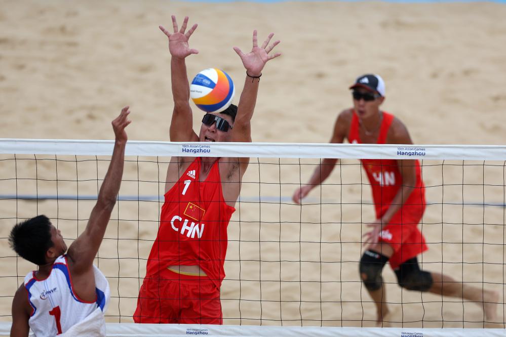 20일 저장성 닝보(寧波)시에서 열린 항저우 아시안게임 비치발리볼 남자 조별리그 A조 경기에서 중국이 2대1필리핀을 꺾었다. 이날 중국 선수(중간) 선수가 필리핀의 공격을 막고 있는 모습. (사진/신화통신)