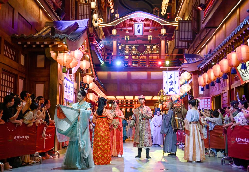 [신화망 베이징 10월11일] 등불을 환하게 밝힌 밤, 한푸(漢服)를 입고 당나라 건축 양식의 거리를 걸으며 예상우의무(霓裳羽衣舞∙당나라 현종이 꿈에 본 달 속 선녀들의 모습을 떠올려 만들었다는 춤)를 감상하고 맛있는 먹거리를 맛본 후 인터랙티브 논플레이어 캐릭터 (non-player character, NPC)가 들려주는 시를 듣는다.