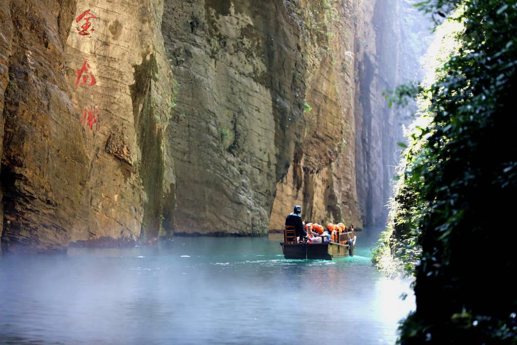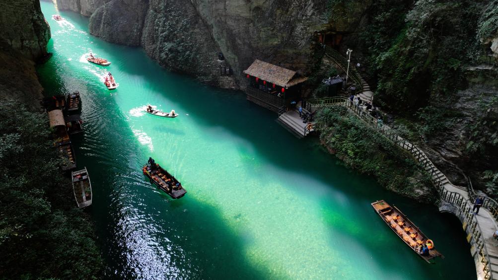가을이 되자 후베이(湖北)성 허펑(鶴峰)현 룽메이(容美)진 핑산(屏山) 관광지에 많은 관광객이 몰렸다. 핑산 관광지는 배를 타면 마치 공중에 떠 있는 느낌을 받을 정도로 강물이 맑다.