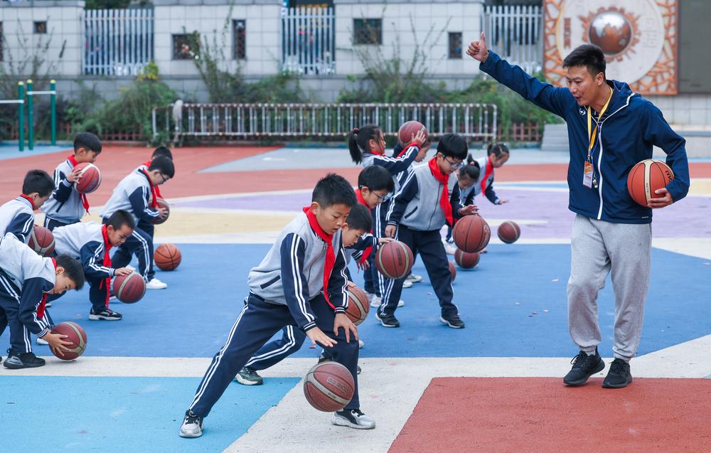 후저우시 웨허(月河)초등교육그룹 지산(吉山)캠퍼스 학생들이 8일 선생님의 지도 아래 농구 연습 중이다. 2023.11.8