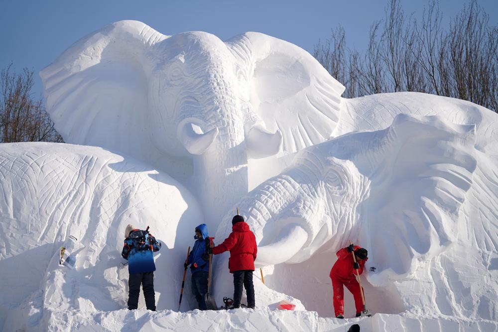 [신화망 하얼빈 12월20일] 눈 조각가가 19일 코끼리를 조각하고 있다.