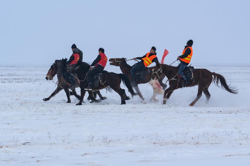 이날 '둥짜이미식문화축제'에서 위구르족 전통 스포츠인 댜오양(叼羊) 경기를 즐기는 유목민들. 2023.12.22