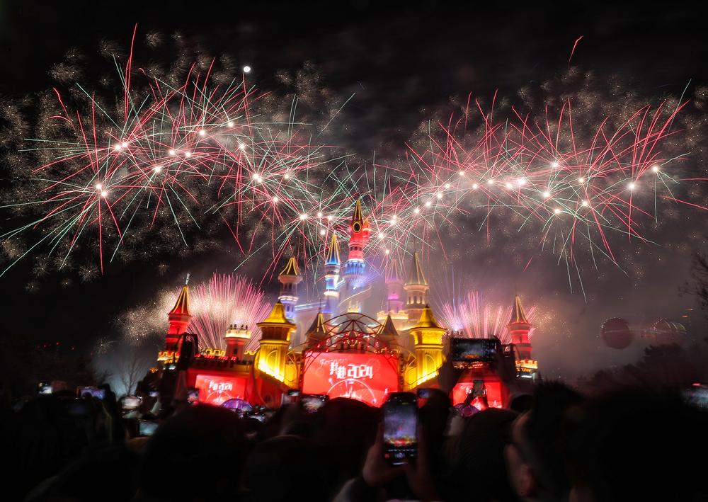 1일 랴오닝(遼寧)성 선양(瀋陽)시에 있는 테마파크 '팡터환러(方特歡樂)세계'에서 불꽃놀이를 관람하는 관광객들. 2023.1.1
