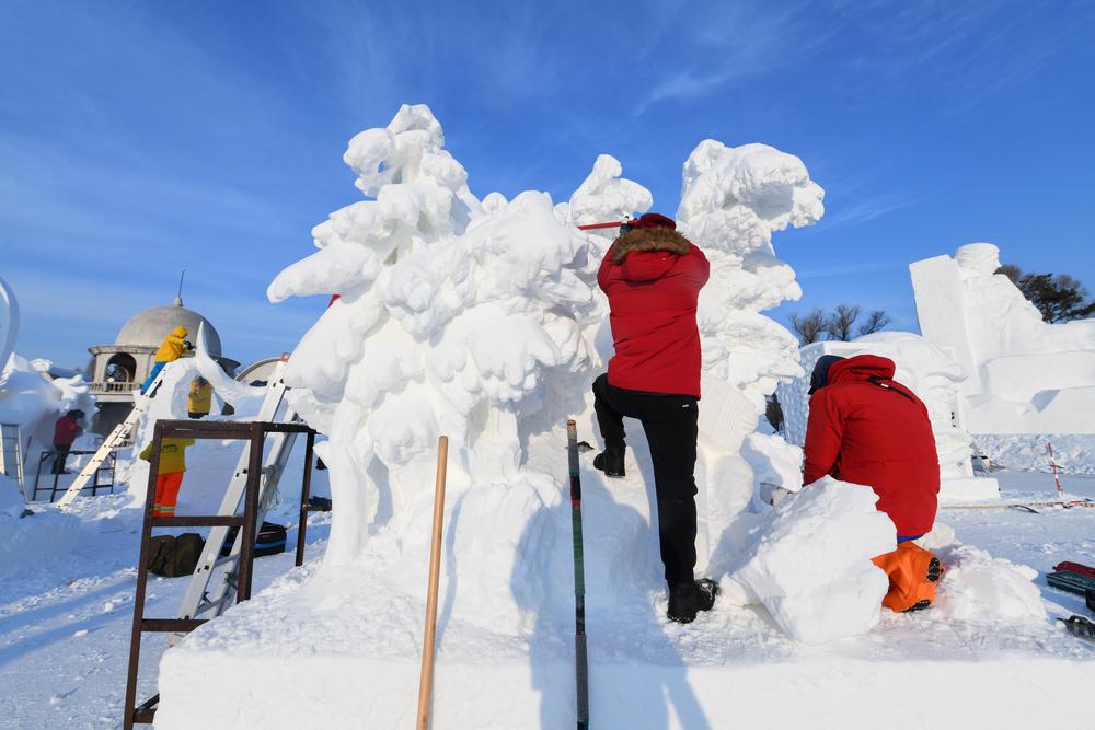 한 참가자가 8일 타이양다오(太陽島) 국제눈조각예술박람회 단지에서 작품을 만들고 있다.