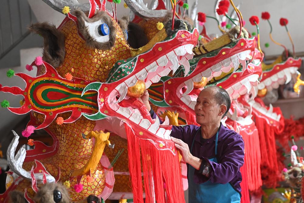 광시(廣西)좡족자치구 무형문화유산 대표 전승자인 쩌우위터(鄒玉特·70)가 16일 파오룽(炮龍) 축제에서 사용할 대형 용을 제작하고 있다.