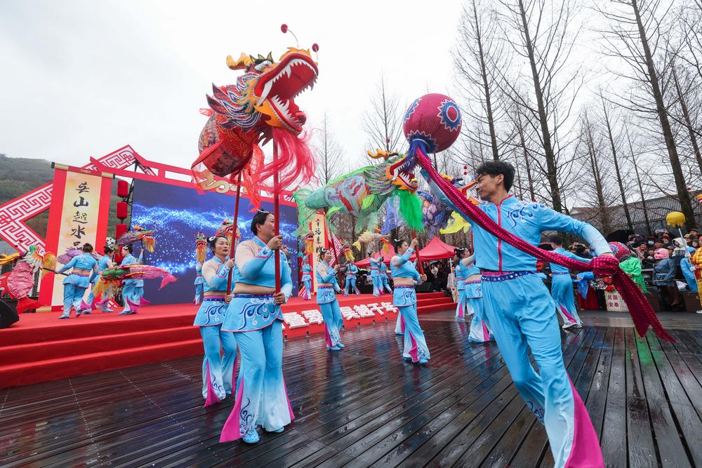 이날 전통 오어(鰲魚·중국 전설 속 동물) 등롱을 든 연기자들이 즈난촌 촌락관광지에서 공연을 선보이고 있다. 2024.1.20