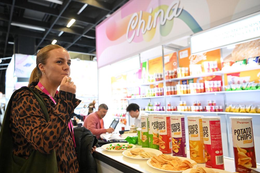 독일 쾰른에서 열린 독일국제제과전시회(ISM)를 찾은 한 여성이 28일(현지시간) 중국 전시구역에서 과자를 시식하고 있다.