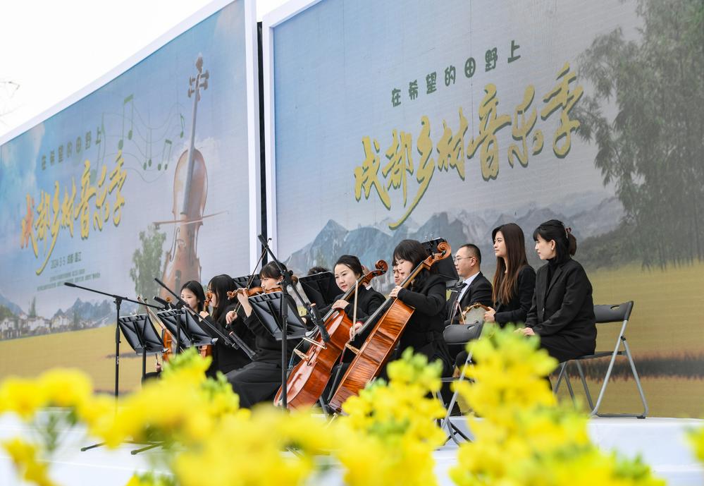 [신화망 청두 3월6일] 교향악단 단원들이 5일 쓰촨(四川)성 청두(成都)시 원장(溫江)구에서 열린 청두 농촌 뮤직 페스티벌 개막식에서 공연을 펼치고 있다.