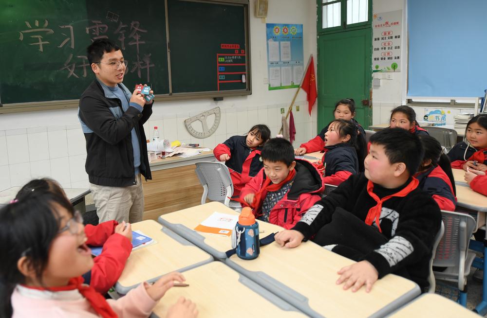 [신화망 안지 3월6일] 5일 학생들과 학급 노래 창작 수업을 진행하는 자원봉사자 리쉐츠(李雪馳).