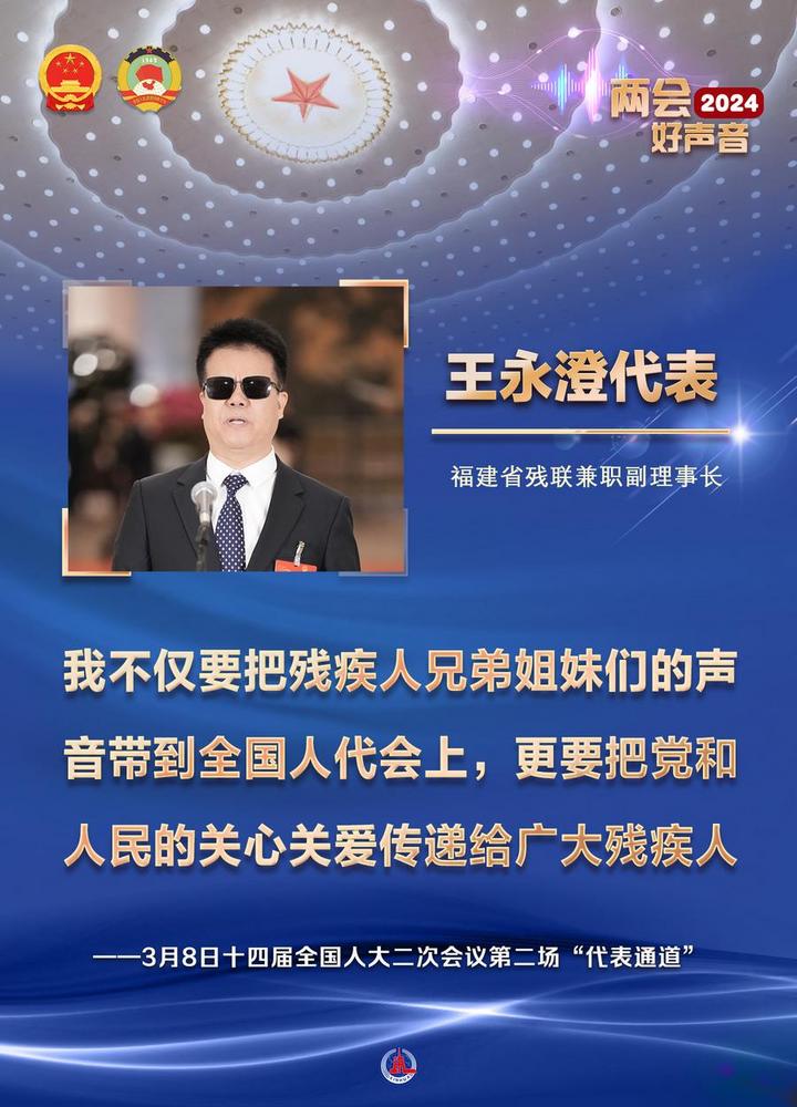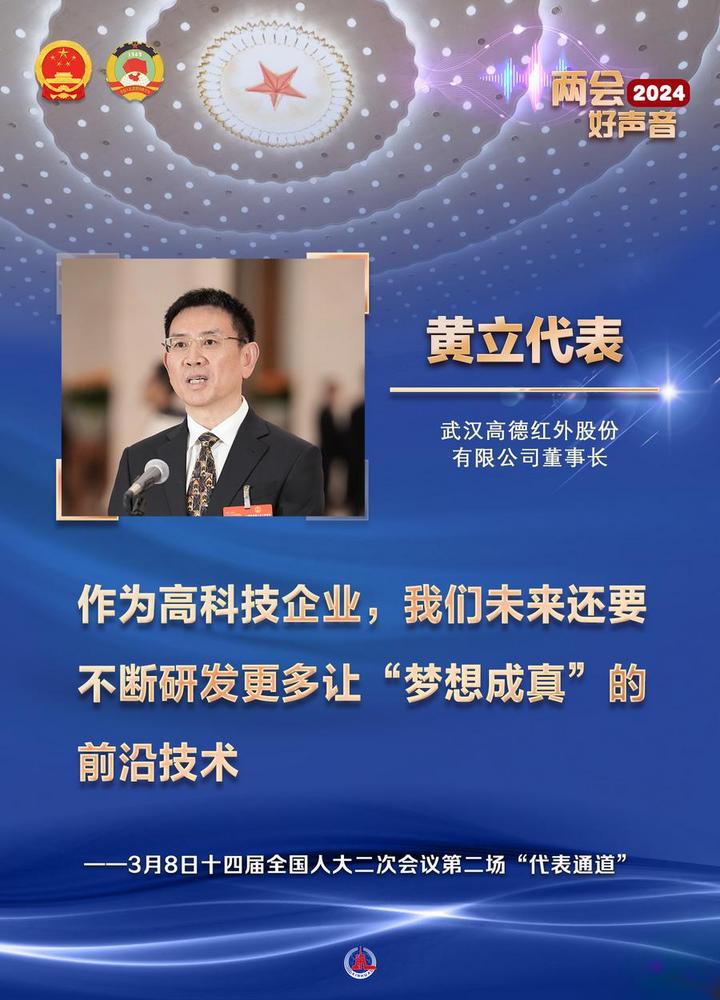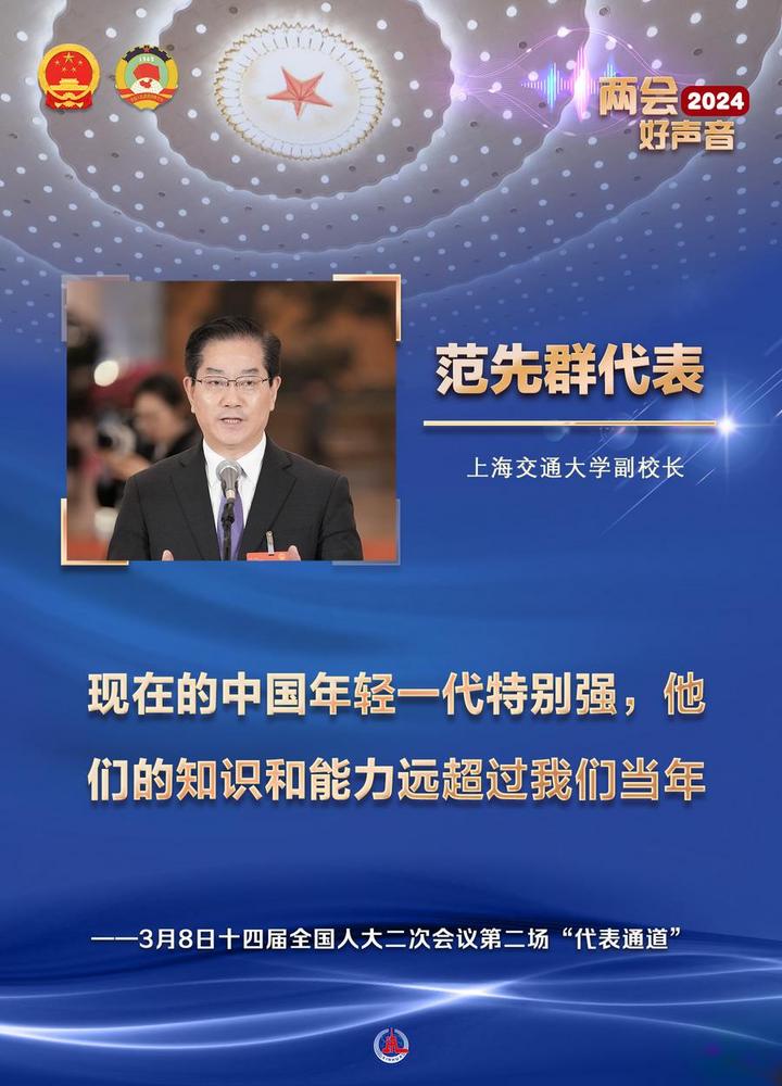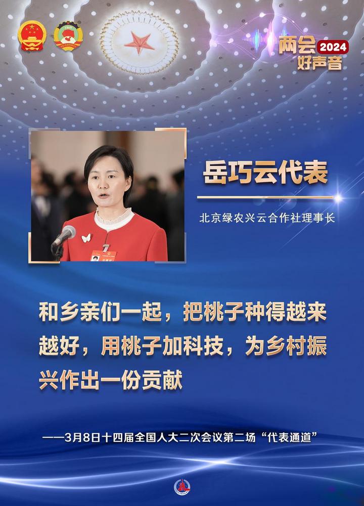 전인대 대표인 왕융청(王永澄) 푸젠(福建)성 장애인연합회 겸직부이사장은 "우리 장애인들의 목소리를 전인대에 가져왔을 뿐만 아니라 중국공산당과 인민의 관심과 사랑을 수많은 장애인에게 전달할 것"이라고 말했다.전인대 대표인 황리(黃立) 우한(武漢) 가오더(高德)적외선회사 회장은 "하이테크 기업으로서 앞으로도 꿈을 실현할 수 있는 프런티어 기술을 끊임없이 연구개발할 것"이라고 밝혔다.전인대 대표인 판셴췬(范先群) 상하이교통대학 부총장은 "지금의 중국 청년은 정말 강하다"면서 "그들의 지식과 능력은 과거 우리의 수준을 크게 넘어섰다"고 강조했다.전인대 대표인 천쥔(陳軍) 난카이(南開)대학 부총장은 "전기차가 더 멀리∙더 빨리 달릴 수 있도록 더 좋은 성능의 더 안전한 배터리를 계속 연구∙생산할 것"이라고 포부를 드러냈다. 전인대 대표인 한펑샹(韓鳳香) 지린(吉林) 리수(梨樹) 펑황산(鳳凰山)농업기계합작사 이사장은 "소득 증대와 부의 창출을 추진하는 동시에 국가 식량 안보에 더 많이 공헌할 수 있도록 농사를 짓고 식량 생산량을 늘리는 데 더욱 힘쓸 것"이라고 밝혔다. 전인대 대표인 웨차오윈(岳巧雲) 베이징 뤼눙싱윈(綠農興雲)합작사 이사장은 "주민들과 함께 복숭아를 잘 키우고 거기에 과학기술을 접목해 향촌 진흥에 기여할 것"이라고 힘줘 말했다.