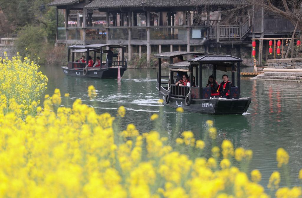 따듯한 봄날, 봄빛을 즐기기 위해 구이저우성 쭌의시 보저우구 우장자이 풍경구를 찾는 관광객들의 발길이 이어지고 있다. 우장자이 국제관광리저트는 고요한 자연환경과 짙은 첸베이(黔北, 구이저우 북부) 민속 분위기를 바탕으로 관광, 레저, 휴가, 전시회를 하나로 모아 첸베이의 유명한 관광지가 된 것으로 알려져 있다.[촬영/신화사 기자 양잉(楊楹)]pagebreak