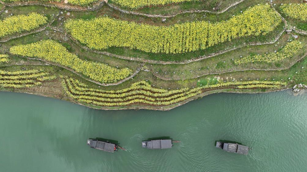 [신화망 구이저우 3월15일]구이저우(貴州)성 쭌의(遵義)시 보저우(播州)구 우장자이(烏江寨) 풍경구를 14일 드론으로 찍었다.