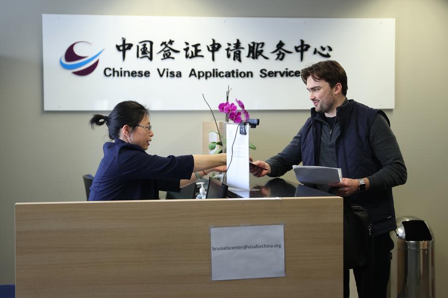 지난 7일 벨기에 브뤼셀에 있는 중국 비자신청서비스센터에서 관련 서류를 제출하는 남성. (사진/신화통신)