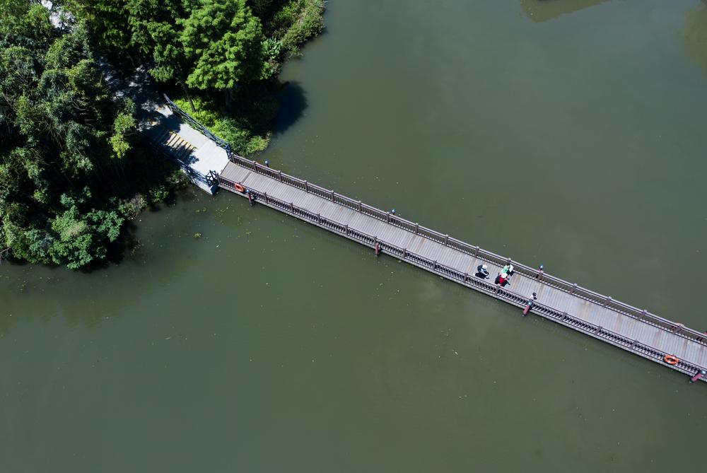[신화망 주지 5월17일] 16일 저장(浙江)성 사오싱(紹興)시 바이타후(白塔湖)국가습지공원의 잔교 위를 걷고 있는 관광객을 드론 사진에 담았다.
