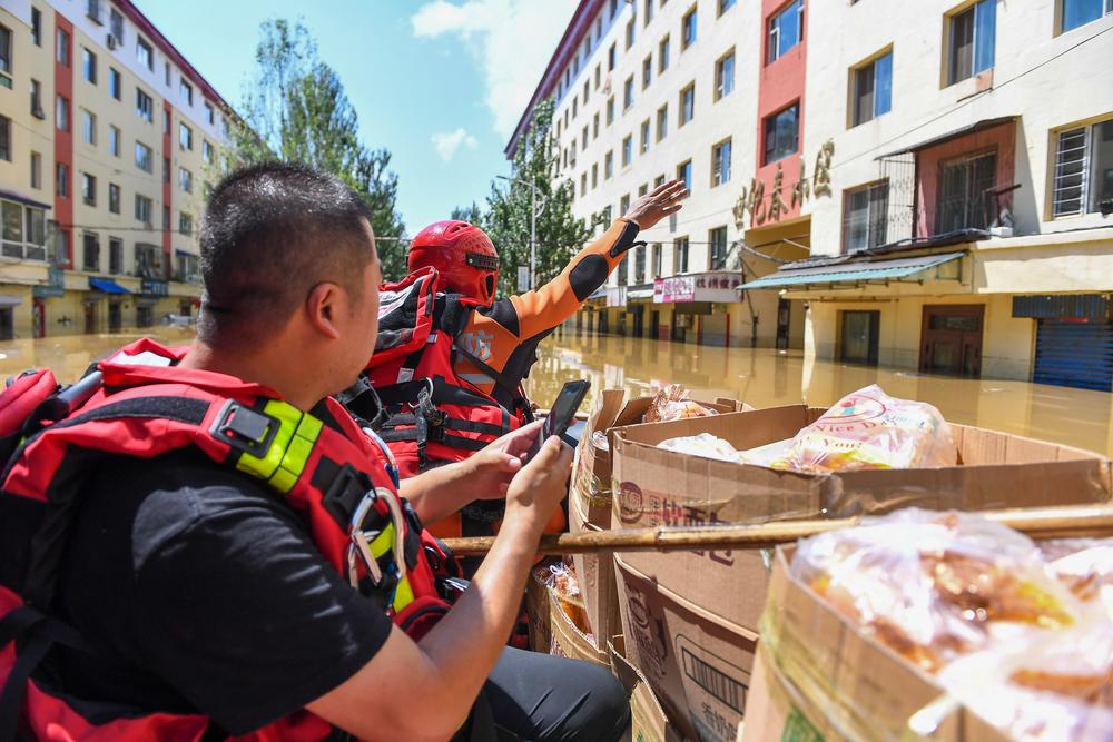 [신화망 린장 7월30일] 소방구조대 대원들이 29일 지린(吉林)성 린장(臨江)시에서 시민들에게 보급물품을 가져다주고 있다.