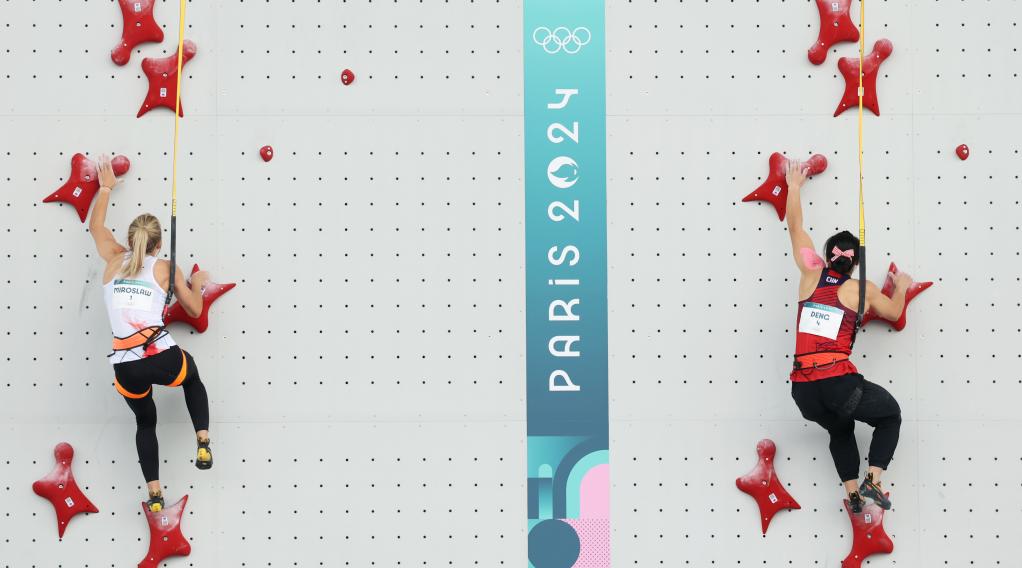 [신화망 파리 8월8일] 중국의 덩리쥐안(鄧麗娟)이7일(현지시간) 열린 파리올림픽 스포츠클라이밍 여자 스피드 결승에서 은메달을 목에 걸었다.pagebreak