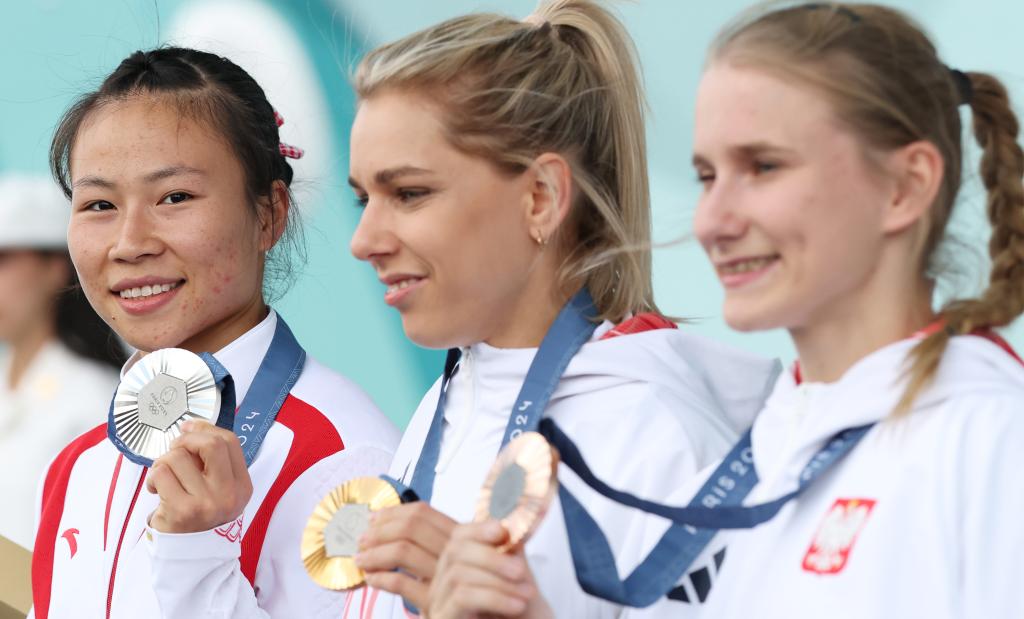 7일(현지시간) 은메달을 딴 중국의 덩리쥐안(왼쪽), 금메달을 딴 폴란드의 알렉산드라 미로슬라프(가운데), 동메달을 딴 폴란드의 알렉산드라 칼루카가 시상식에 참석해 있다.