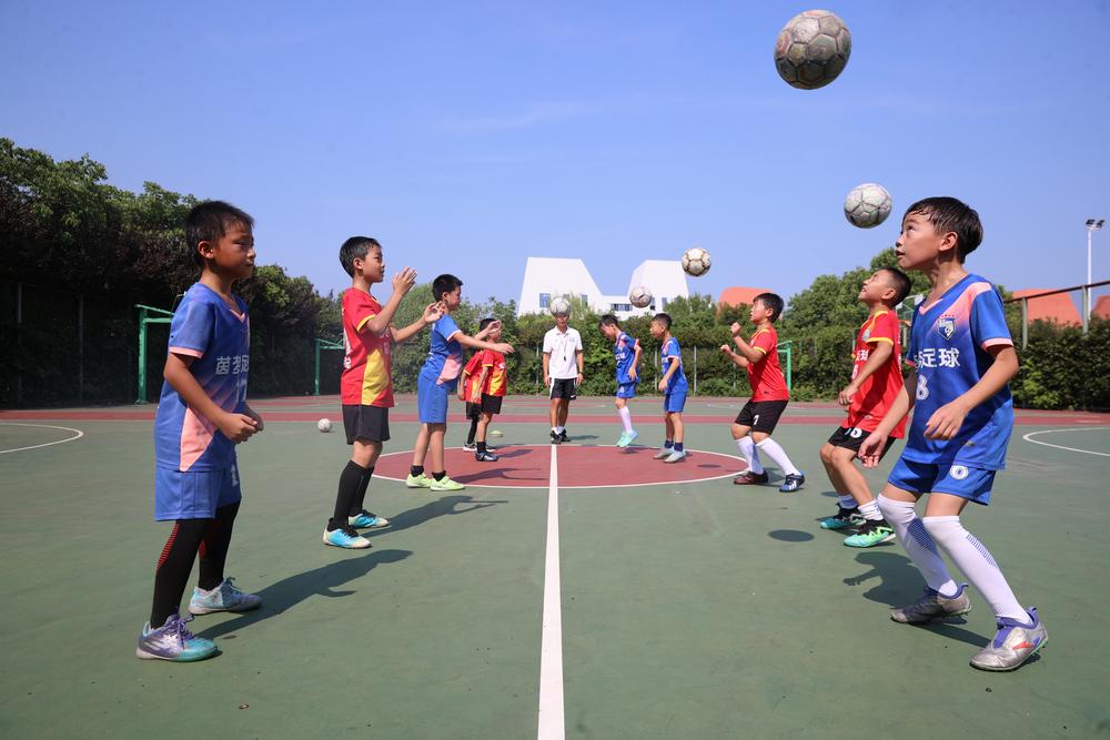 어린이들이 8일 저장(浙江)성 후저우(湖州)시 우싱(吳興)구의 한 축구장에서 헤딩 연습을 하고 있다.