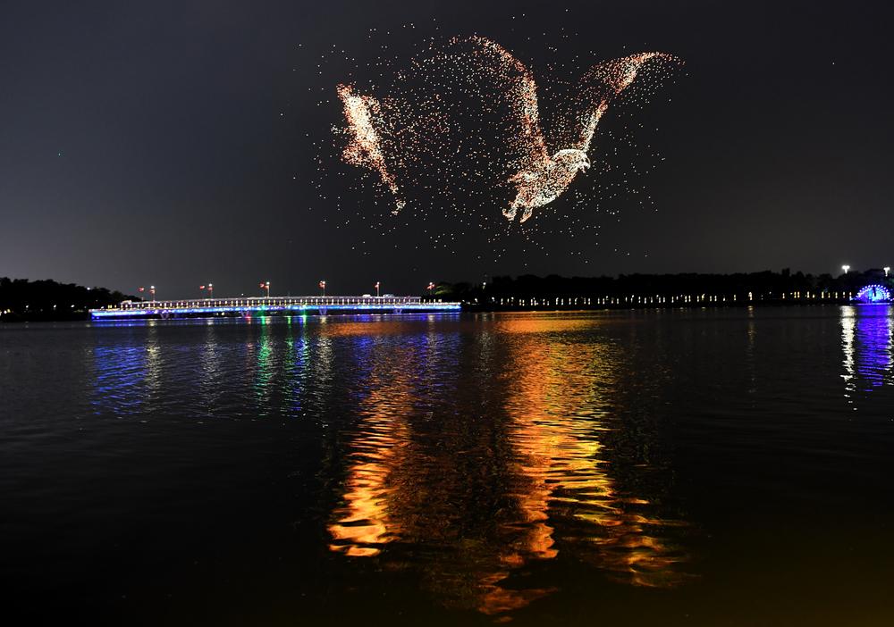 26일 저녁 국경절 맞이 드론쇼가 광둥(廣東)성 선전(深圳)시에 위치한 선전완(深圳灣)공원에서 열렸다. 1만197대의 드론은 관광객에게 과학기술과 예술이 어우러진 시각적 향연을 선사했다.