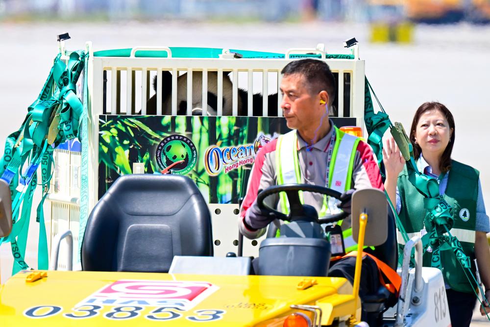 이날 중국 중앙정부가 세 번째로 홍콩에 기증한 자이언트 판다 한 쌍인 '안안(安安)'과 '커커(可可)'가 전용기를 타고 홍콩국제공항에 도착했다. 이후 두 마리의 판다는 전용차량으로 갈아타 홍콩해양공원에 마련된 새 보금자리에 도착했다. 2024.9.26