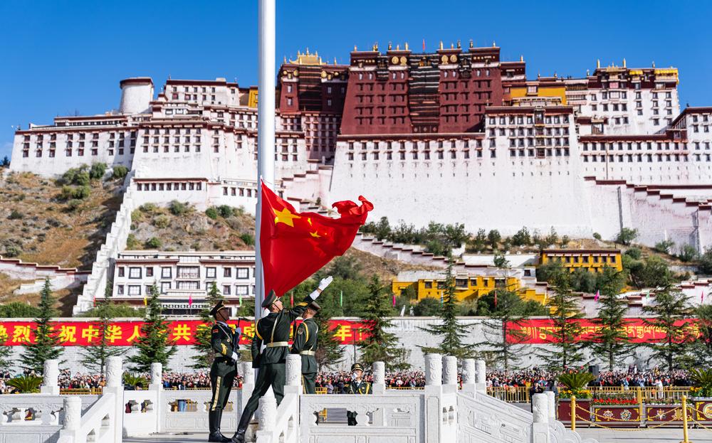 이날 시짱(西藏)자치구 라싸(拉薩)시 포탈라궁(布達拉宮) 광장에서 국기 게양식이 거행되고 있다. 2024.10.1