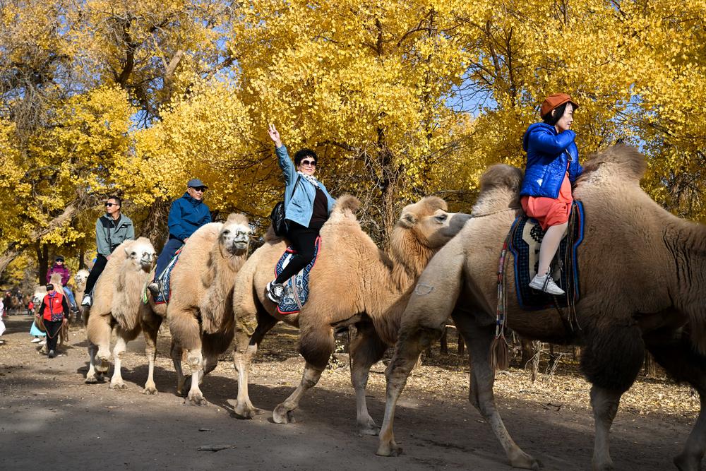 네이멍구(內蒙古)자치구 아라산(阿拉善)맹 어지나(額濟納)기 백양나무숲(胡楊林) 관광지를 찾은 관광객들이 13일 낙타를 타고 있다.