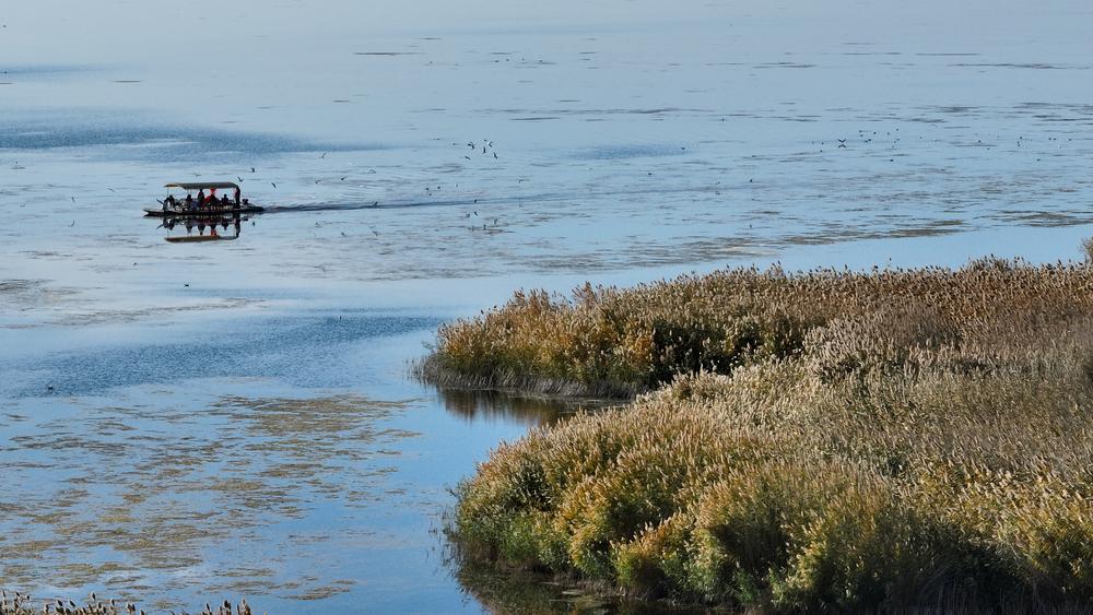 14일 쥐옌하이(居延海) 관광지에서 배를 타고 풍경을 감상하는 관광객들을 드론으로 내려다봤다. 2024.10.15